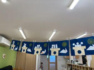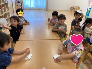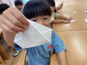 折り紙では、1つ1つの工程を確認しながら作っていました。少し難しい所もありましたが、最後まで頑張って折っていましたよ。