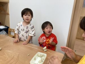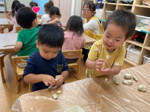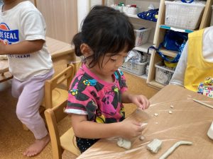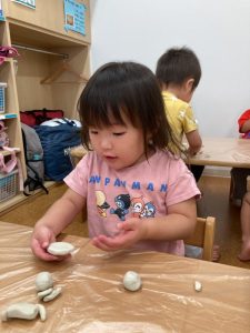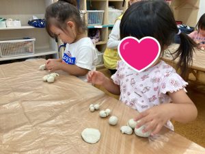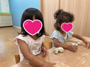 粘土の感触や遊び方もわかってきて、丸めたり伸ばしたりちぎったりをしながら楽しむ姿が見られています🙌💞