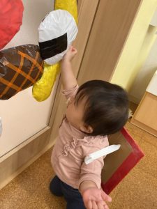 最後は背負っていた食べ物を壁(運動会本番は大きなバスのパネル)に