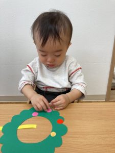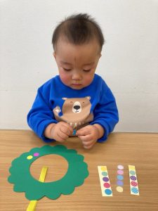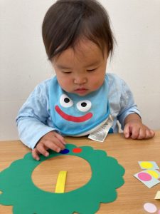 めばえ組は、シールを剥がすのを保育者に手伝ってもらいながら