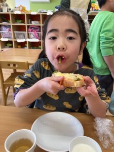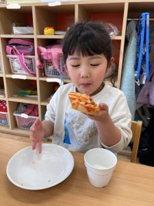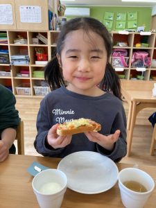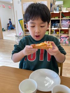自分で作ったピザトーストをとても幸せそうに頬張る子どもたちでした💞